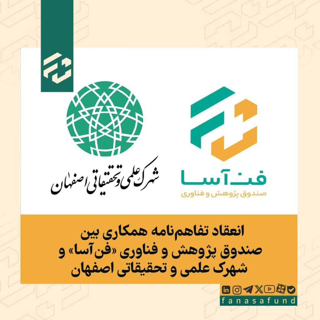 با هدف تقویت زیرساختهای حمایتی از نوآوری و کارآفرینی دانشبنیان، تفاهمنامه همکاری مشترکی بین صندوق پژوهش و فناوری فنآسا و شهرک علمی و تحقیقاتی اصفهان منعقد شد.